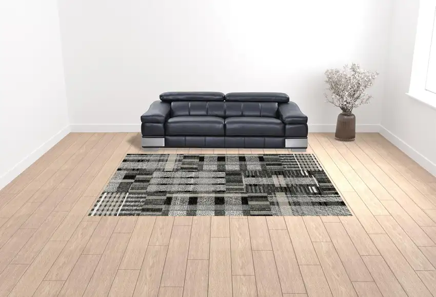 Ideal for modern homes, the rug features an eye-catching geometric pattern in neutral shades of black, grey, and ivory. Its contemporary design effortlessly enhances any living space.