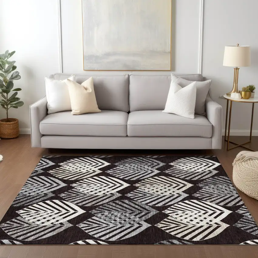 Black Silver And Charcoal Floral Washable Indoor Outdoor Area Rug