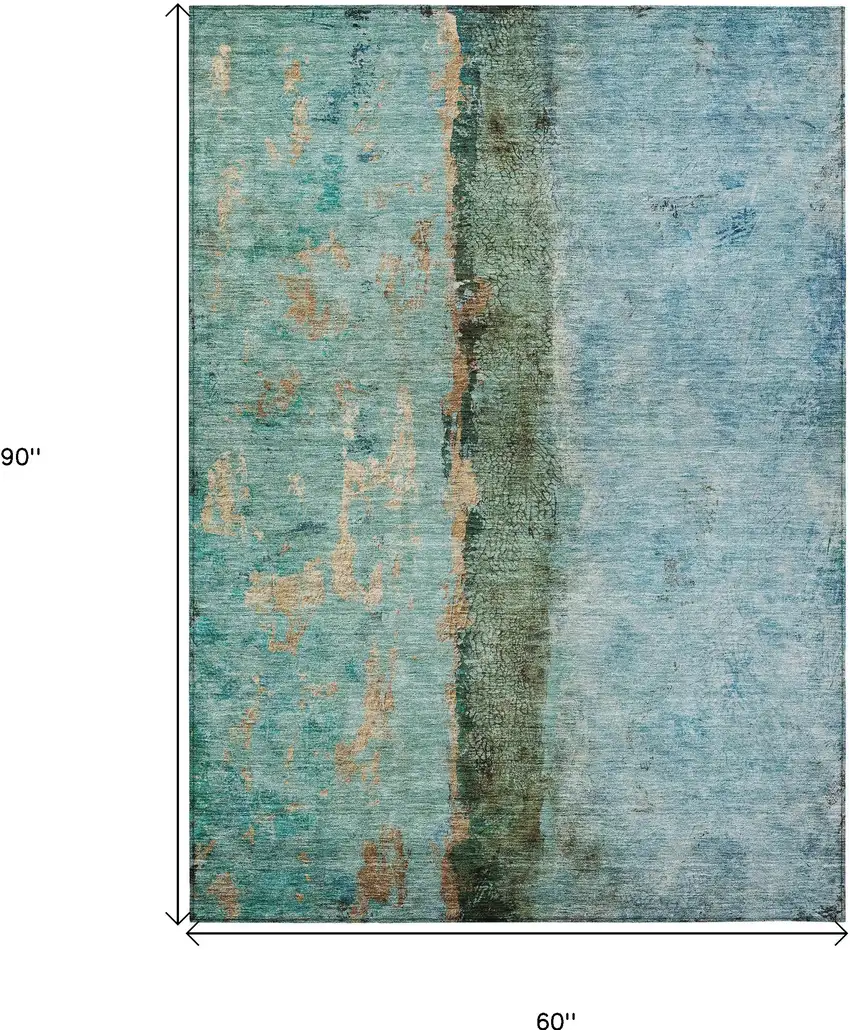 Blue And Gold Abstract Washable Indoor Outdoor Area Rug