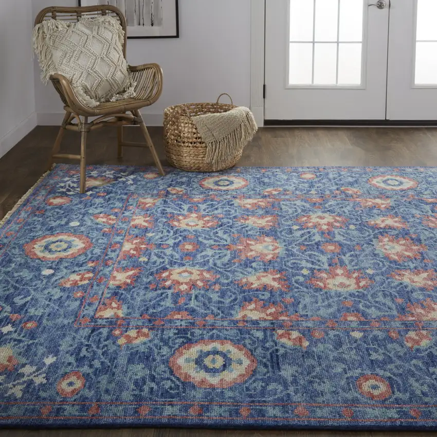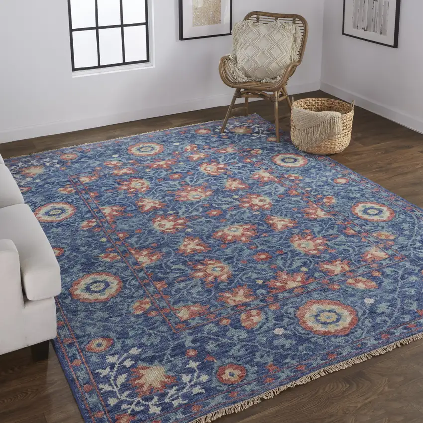 Blue And Red Wool Floral Hand Knotted Stain Resistant Area Rug