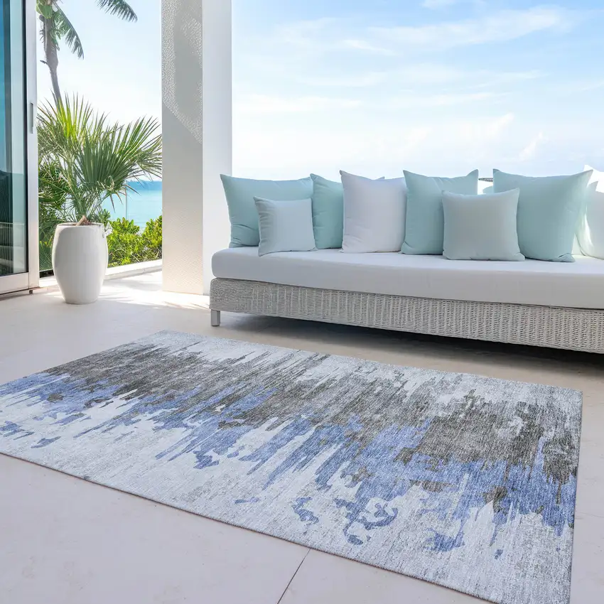 Set an inviting tone in your space with this 9-foot x 12-foot blue gray and silver abstract washable indoor outdoor area rug. This rectangle shaped rug features a abstract design that will work well both indoors or out. A classic shape marries with good looking design for your living room, hall, bedroom, porch, patio, or poolside. Ideal for outdoor spaces or high traffic areas with kids and pets, this rug is made from heavy duty polyester that is stain resistant to help repel water, dirt, and stains. Versatile in use, durable, and easy to maintain, this rug is an ideal solution to add a decorative and inviting touch to your indoor or outdoor space. 108-inch h x 144-inch w x 0.19-inch d.