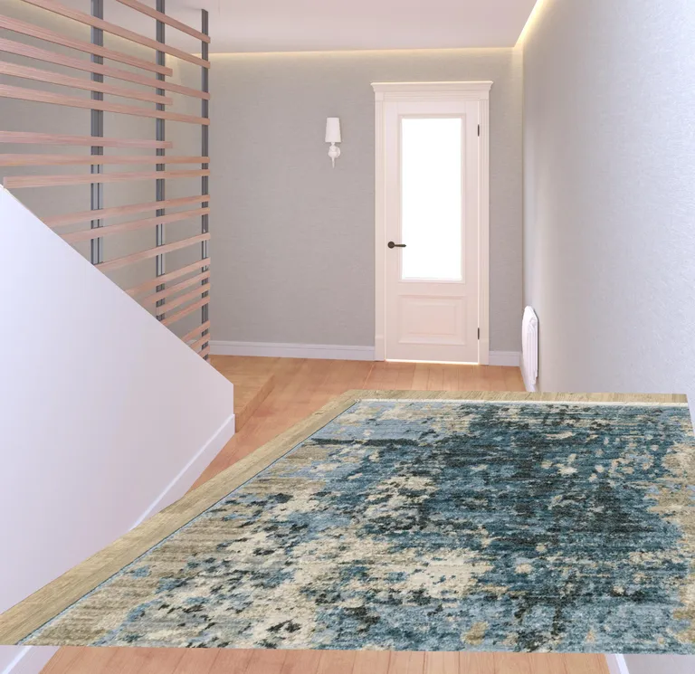 The rug features an intriguing abstract pattern with attractive hues of blue, grey, ivory, and dark blue. It's a striking piece that'll add a touch of modern appeal to your home.