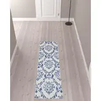Revitalize your home's ambiance with the exquisite beauty of the Blue Ivory Machine-Woven Medallion Indoor Runner Rug. Crafted with passion and precision, this stunning rug is designed to enrich your space with its luxurious elegance and timeless appeal.