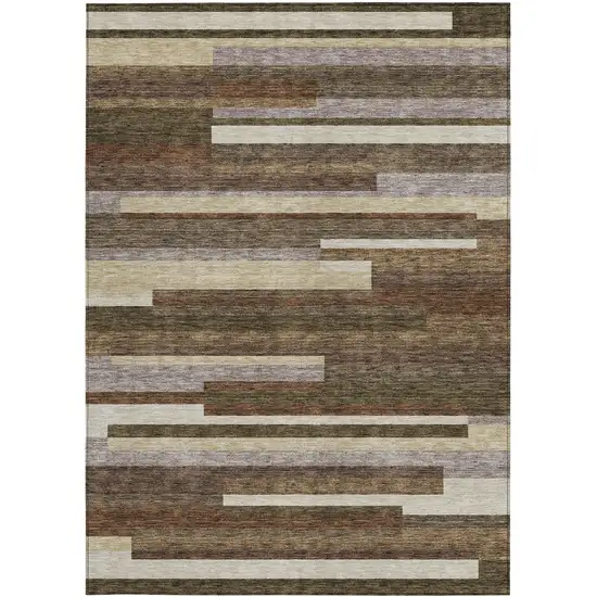 Add some artistry to your room with this 9-foot x 12-foot brown beige and copper striped washable indoor outdoor area rug. This rectangle shaped rug features a striped design that will work well both indoors or out. A classic shape marries with good looking design for your living room, hall, bedroom, porch, patio, or poolside. Ideal for outdoor spaces or high traffic areas with kids and pets, this rug is made from heavy duty polyester that is stain resistant to help repel water, dirt, and stains. Versatile in use, durable, and easy to maintain, this rug is an ideal solution to add a decorative and inviting touch to your indoor or outdoor space. 108-inch h x 144-inch w x 0.19-inch d.