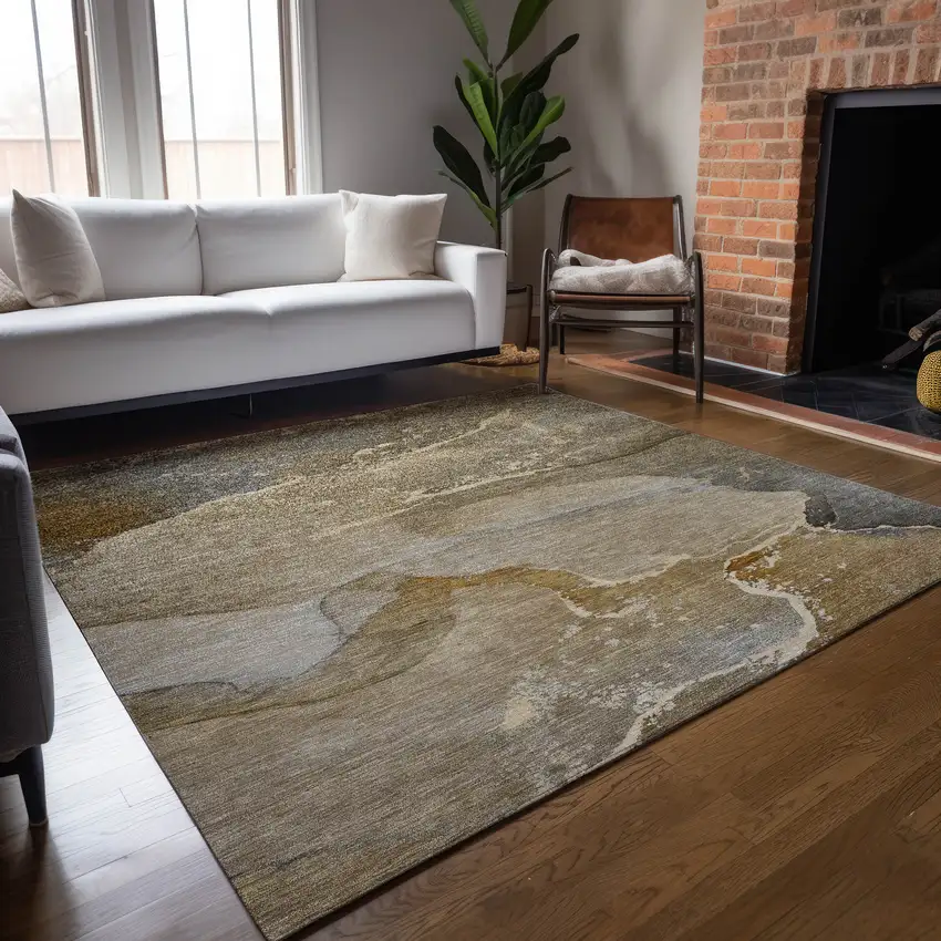 Brown Beige and Gold Abstract Washable Indoor Outdoor Area Rug