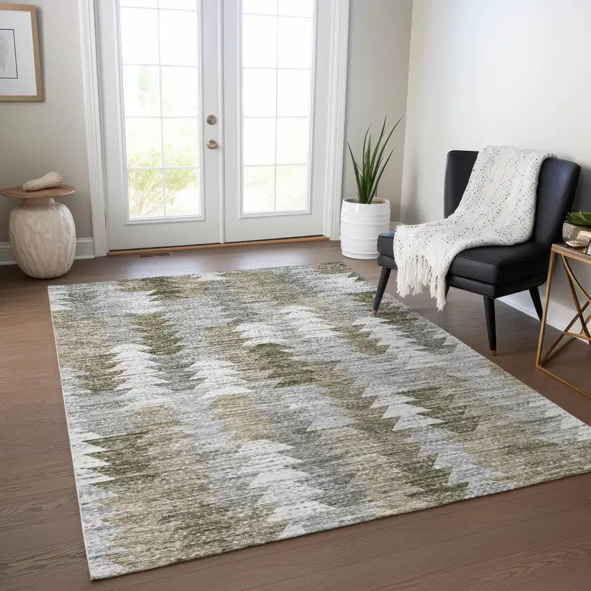 Add some artistry to your room with this 5-foot x 8-foot brown beige and gray geometric washable indoor outdoor area rug. This rectangle shaped rug features a geometric design that will work well both indoors or out. A classic shape marries with good looking design for your living room, hall, bedroom, porch, patio, or poolside. Ideal for outdoor spaces or high traffic areas with kids and pets, this rug is made from heavy duty polyester that is stain resistant to help repel water, dirt, and stains. Versatile in use, durable, and easy to maintain, this rug is an ideal solution to add a decorative and inviting touch to your indoor or outdoor space. 60-inch h x 90-inch w x 0.19-inch d.