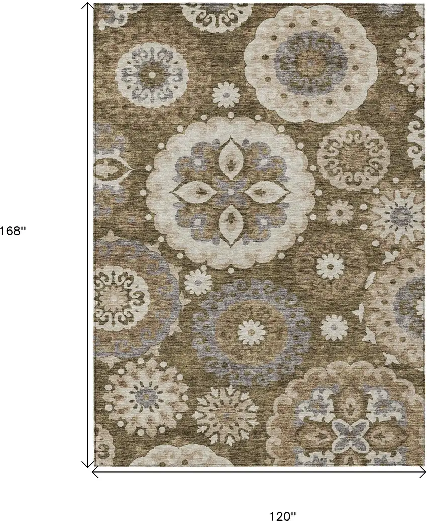 This 10-foot x 14-foot brown ivory and beige floral medallion washable indoor outdoor area rug, is a great way to add warmth to a room. This rectangle shaped rug features a floral medallion design that will work well both indoors or out. A classic shape marries with good looking design for your living room, hall, bedroom, porch, patio, or poolside. Ideal for outdoor spaces or high traffic areas with kids and pets, this rug is made from heavy duty polyester that is stain resistant to help repel water, dirt, and stains. Versatile in use, durable, and easy to maintain, this rug is an ideal solution to add a decorative and inviting touch to your indoor or outdoor space. 120-inch h x 168-inch w x 0.19-inch d.