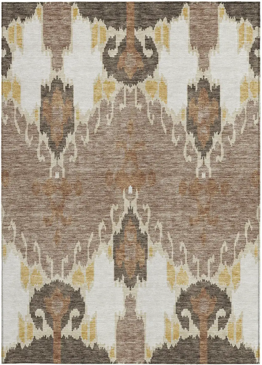 This 8-foot x 10-foot brown taupe and beige ikat washable indoor outdoor area rug, is a great way to add warmth to a room. This rectangle shaped rug features a ikat design that will work well both indoors or out. A classic shape marries with good looking design for your living room, hall, bedroom, porch, patio, or poolside. Ideal for outdoor spaces or high traffic areas with kids and pets, this rug is made from heavy duty polyester that is stain resistant to help repel water, dirt, and stains. Makes a great way to dress up your patio, porch, or poolside, but also works well as a durable and easy to maintain option in the kitchen, family room, or mudroom. 96-inch h x 120-inch w x 0.19-inch d.