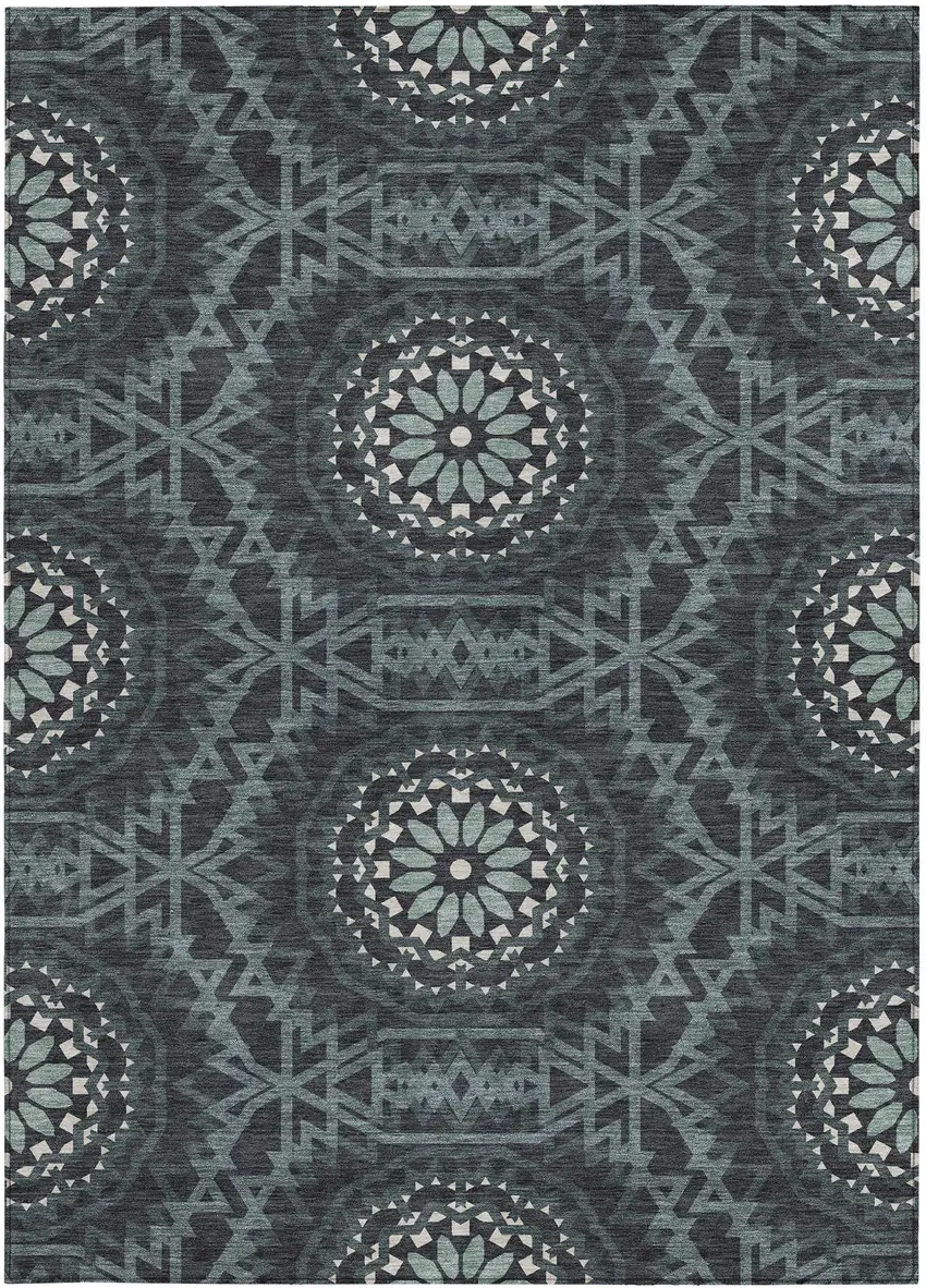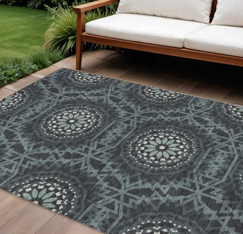 Charcoal Gray And Ivory Floral Medallion Washable Indoor Outdoor Area Rug