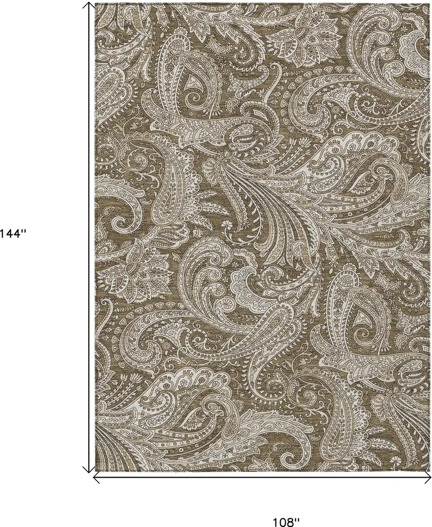 Set an inviting tone in your space with this 9-foot x 12-foot chocolate beige and ivory paisley washable indoor outdoor area rug. This rectangle shaped rug features a paisley design that will work well both indoors or out. A classic shape marries with good looking design for your living room, hall, bedroom, porch, patio, or poolside. Ideal for outdoor spaces or high traffic areas with kids and pets, this rug is made from heavy duty polyester that is stain resistant to help repel water, dirt, and stains. Makes a great way to dress up your patio, porch, or poolside, but also works well as a durable and easy to maintain option in the kitchen, family room, or mudroom. 108-inch h x 144-inch w x 0.19-inch d.