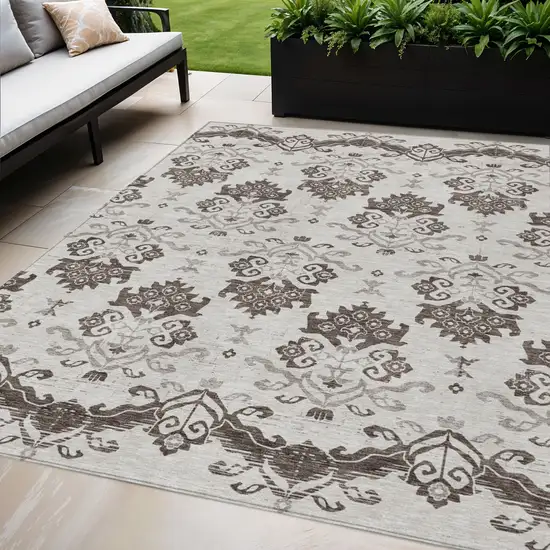 Add some artistry to your room with this 5-foot x 8-foot chocolate taupe and beige oriental washable indoor outdoor area rug. This rectangle shaped rug features a oriental design that will work well both indoors or out. A classic shape marries with good looking design for your living room, hall, bedroom, porch, patio, or poolside. Ideal for outdoor spaces or high traffic areas with kids and pets, this rug is made from heavy duty polyester that is stain resistant to help repel water, dirt, and stains. Makes a great way to dress up your patio, porch, or poolside, but also works well as a durable and easy to maintain option in the kitchen, family room, or mudroom. 60-inch h x 90-inch w x 0.19-inch d.