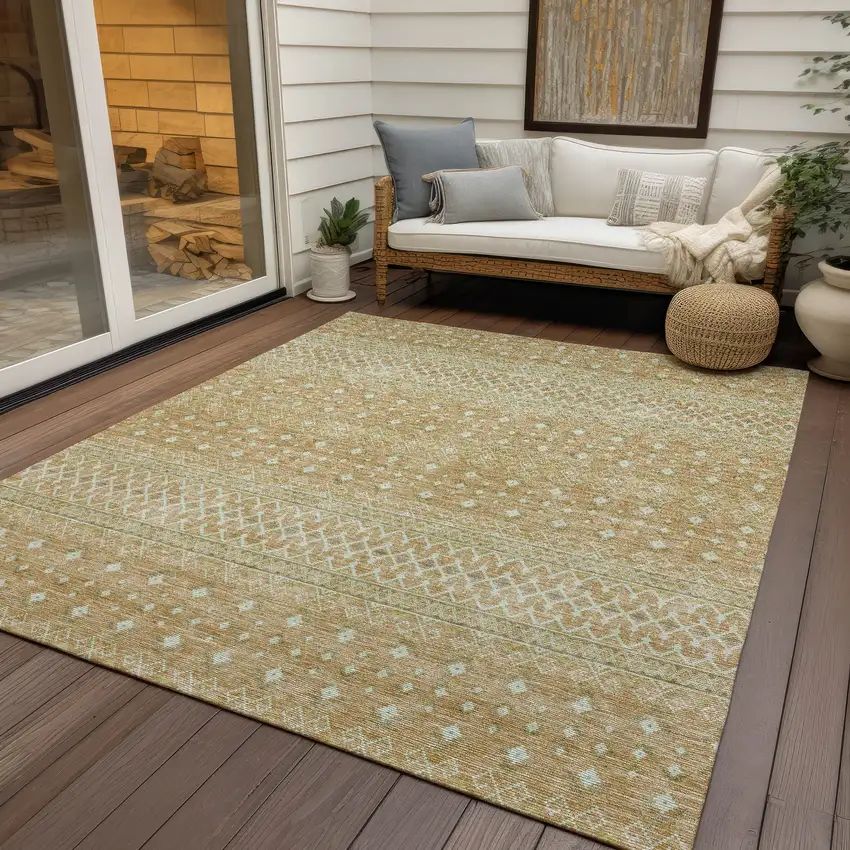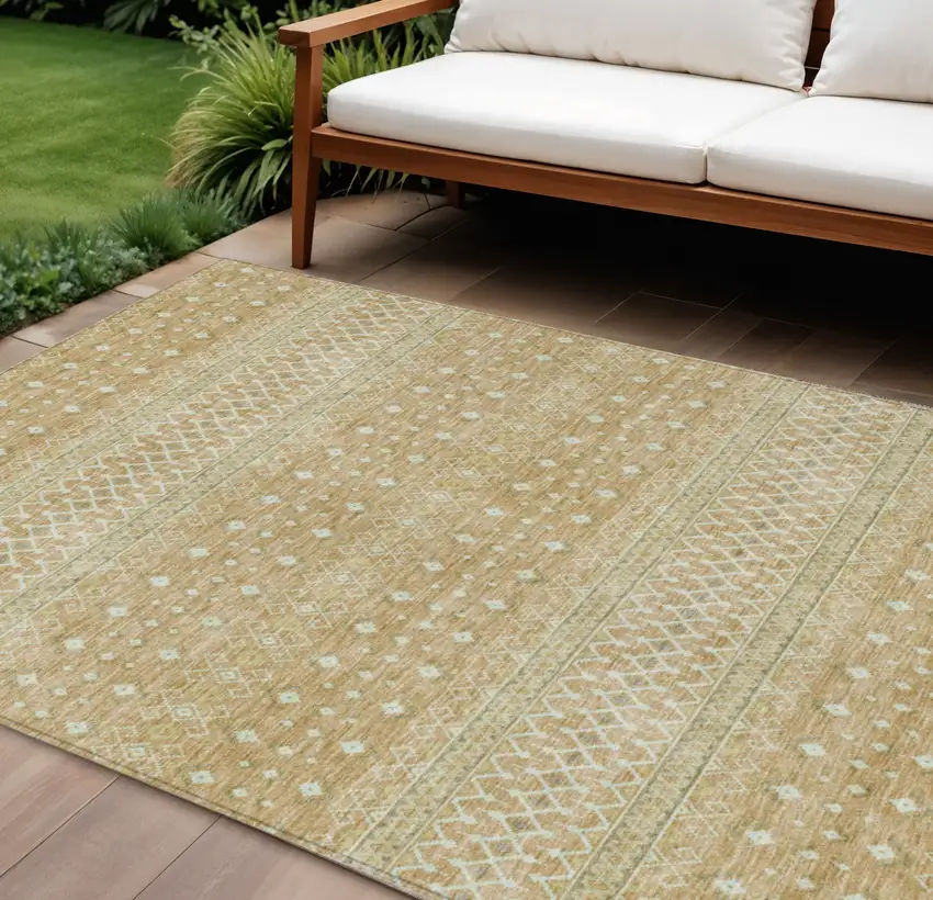Add some artistry to your room with this 10-foot x 14-foot copper ivory and olive green tribal washable indoor outdoor area rug. This rectangle shaped rug features a tribal design that will work well both indoors or out. A classic shape marries with good looking design for your living room, hall, bedroom, porch, patio, or poolside. Ideal for outdoor spaces or high traffic areas with kids and pets, this rug is made from heavy duty polyester that is stain resistant to help repel water, dirt, and stains. Makes a great way to dress up your patio, porch, or poolside, but also works well as a durable and easy to maintain option in the kitchen, family room, or mudroom. 120-inch h x 168-inch w x 0.19-inch d.