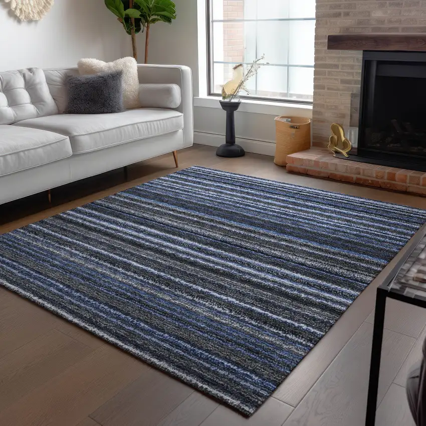 Denim Blue And Gray Striped Washable Indoor Outdoor Area Rug