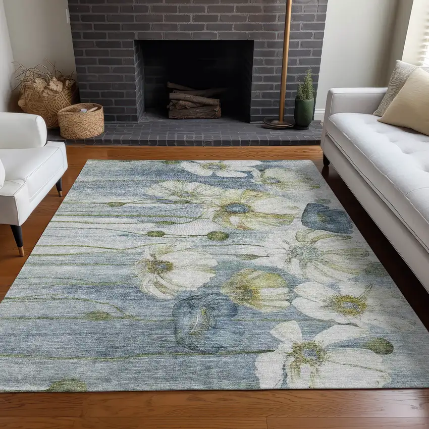 Set an inviting tone in your space with this 8-foot x 10-foot denim blue and sky blue floral washable indoor outdoor area rug. This rectangle shaped rug features a floral design that will work well both indoors or out. A classic shape marries with good looking design for your living room, hall, bedroom, porch, patio, or poolside. Ideal for outdoor spaces or high traffic areas with kids and pets, this rug is made from heavy duty polyester that is stain resistant to help repel water, dirt, and stains. Makes a great way to dress up your patio, porch, or poolside, but also works well as a durable and easy to maintain option in the kitchen, family room, or mudroom. 96-inch h x 120-inch w x 0.19-inch d.
