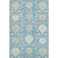 Denim Blue Gray And Silver Damask Washable Area Rug With UV Protection