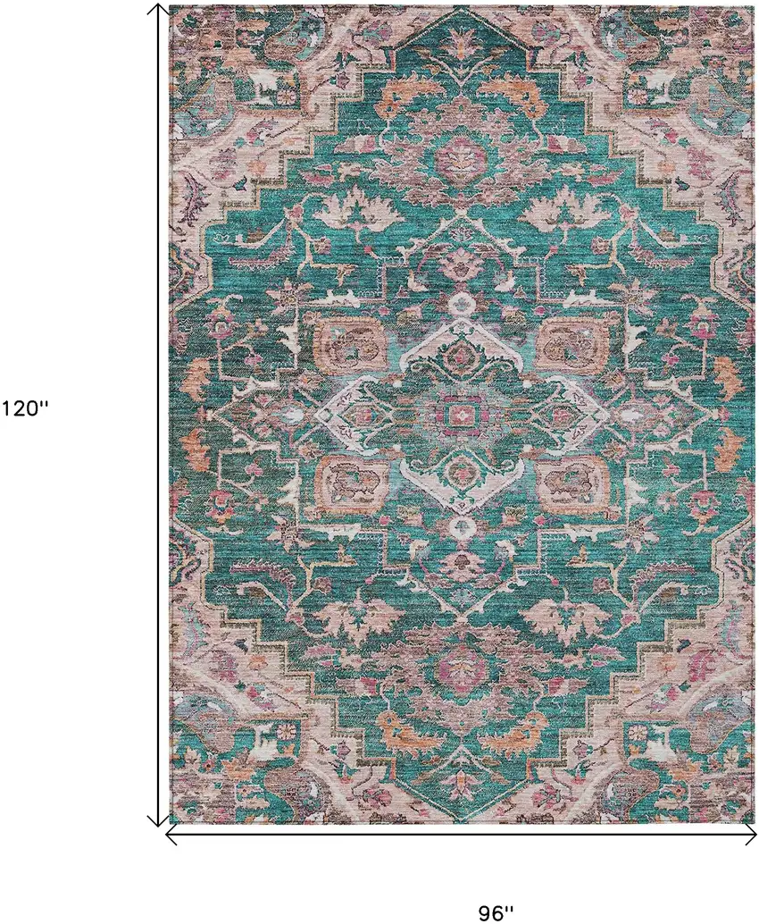 Add great coloration and comfortable texture to your space with this 8-foot x 10-foot emerald teal blue and beige oriental washable indoor outdoor area rug. This rectangle shaped rug features a oriental design that will work well both indoors or out. A classic shape marries with good looking design for your living room, hall, bedroom, porch, patio, or poolside. Ideal for outdoor spaces or high traffic areas with kids and pets, this rug is made from heavy duty polyester that is stain resistant to help repel water, dirt, and stains. Makes a great way to dress up your patio, porch, or poolside, but also works well as a durable and easy to maintain option in the kitchen, family room, or mudroom. 96-inch h x 120-inch w x 0.19-inch d.