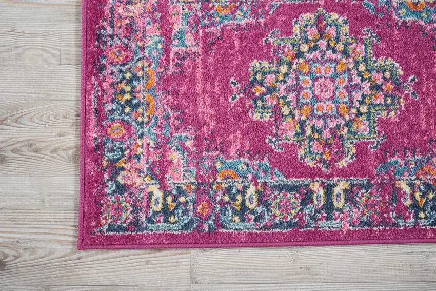 Immerse your room in tranquility with this strikingly beautiful rug featuring a unique blend of fuchsia and blue. This rug is designed to give your space a stylish, distressed look.