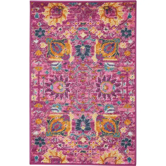 Splash your floor with pizzazz using this fuchsia and orange scatter rug. Its distressed design infuses a touch of artistry into any room setting.