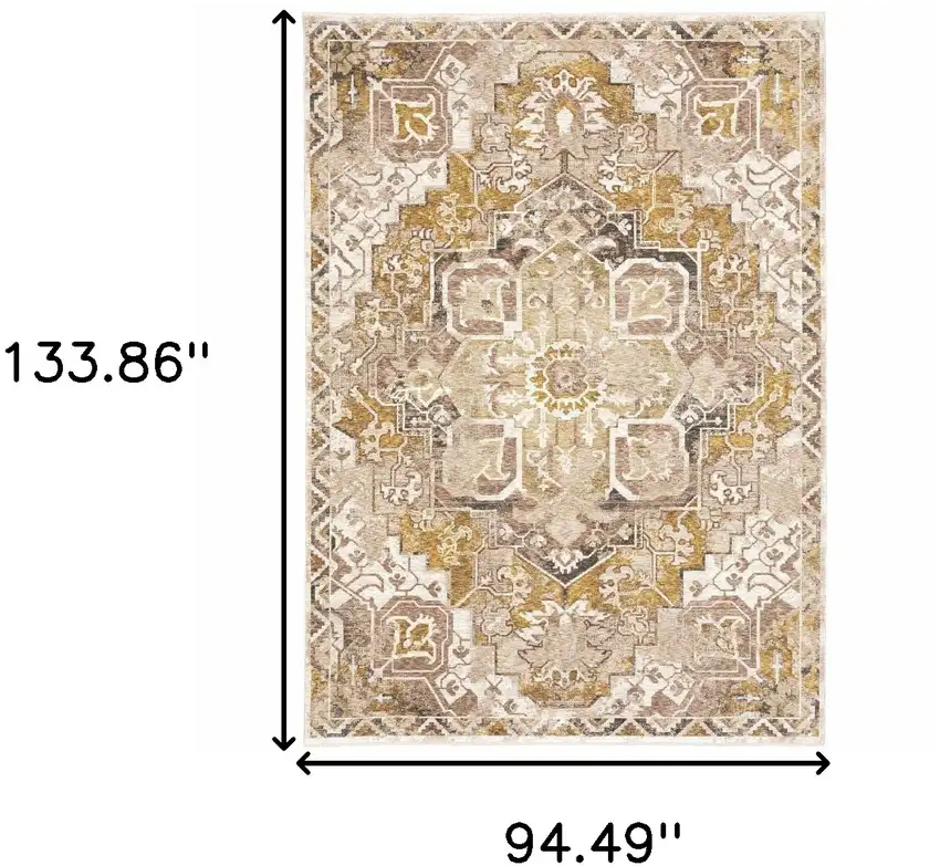 Transform your space into a haven of sophistication and style with our exquisite Gold and Ivory Oriental Power Loom Stain-Resistant Area Rug with Fringe. Crafted with utmost care and attention to detail, this luxurious rug is designed to bring warmth and elegance to any room in your home. Whether you're looking to revamp your living room, bedroom, or office, this rug is the perfect choice to add a touch of timeless beauty.