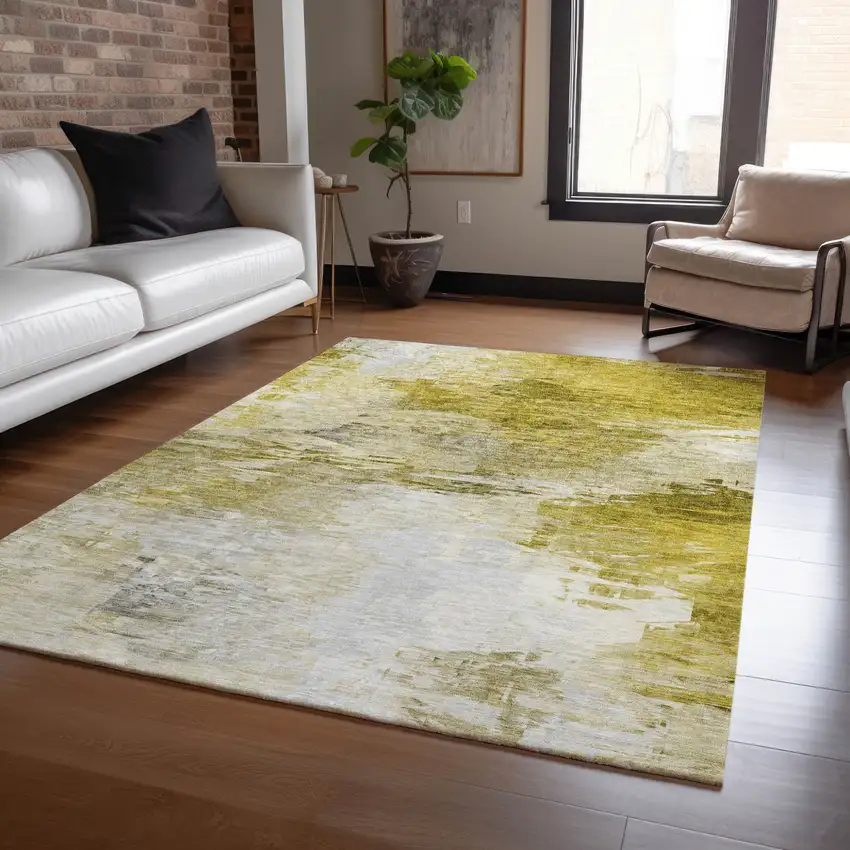Set an inviting tone in your space with this 9-foot x 12-foot gold beige and wheat abstract washable indoor outdoor area rug. This rectangle shaped rug features a abstract design that will work well both indoors or out. A classic shape marries with good looking design for your living room, hall, bedroom, porch, patio, or poolside. Ideal for outdoor spaces or high traffic areas with kids and pets, this rug is made from heavy duty polyester that is stain resistant to help repel water, dirt, and stains. Versatile in use, durable, and easy to maintain, this rug is an ideal solution to add a decorative and inviting touch to your indoor or outdoor space. 108-inch h x 144-inch w x 0.19-inch d.