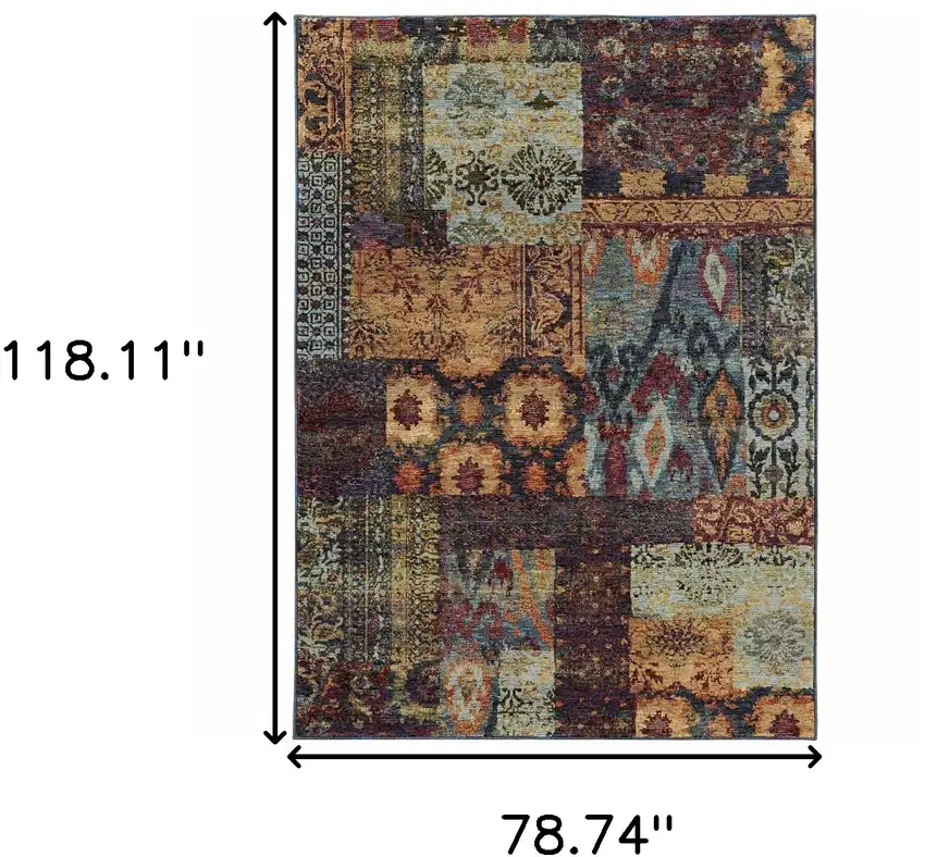 This stunning multi-colored area rug boasts vivid shades of gold, blue, purple, green, and red. An abstract pattern makes it a remarkable choice to elevate any room's decor.