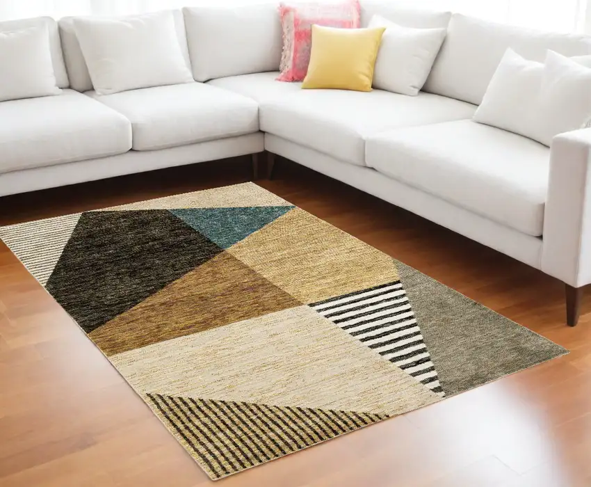 This area rug showcases aesthetic geometric patterns in gold, brown, blue, charcoal, rust, and beige hues. It adds a splash of color and modern style to any interior space.