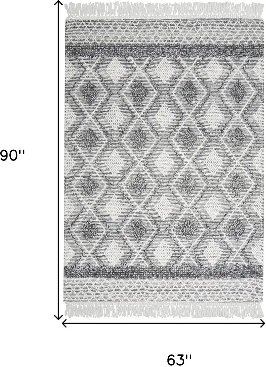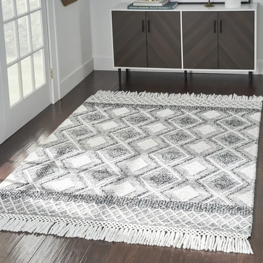 This 5-foot x 8-foot gray and ivory geometric flatweave handmade area rug with fringe, is a great way to add warmth to a room. This rectangle shaped rug features a geometric design in gray and ivory to give it visual interest. A classic shape marries with good looking design for your space tassel ends bring a timeless and fashionable look to your interior. Place this area rug against a hardwood or tile floor and it will enliven your living space with style and sophistication. 63-inch H x 90-inch W x 0.5-inch D