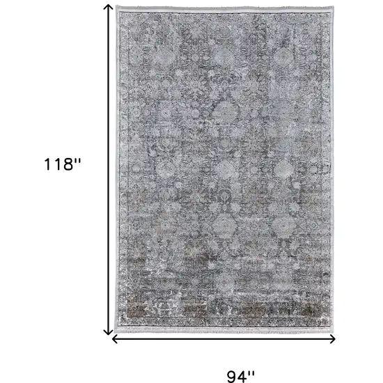Gray and Silver Damask Power Loom Worn Faded Area Rug