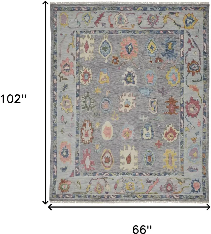 Gray Blue and Red Wool Oriental Hand Knotted Area Rug With Fringe