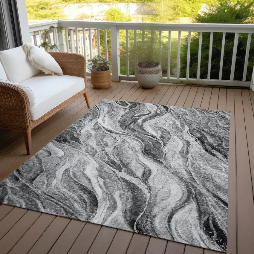 Add great coloration and comfortable texture to your space with this 9-foot x 12-foot gray charcoal and ivory abstract washable indoor outdoor area rug. This rectangle shaped rug features a abstract design that will work well both indoors or out. A classic shape marries with good looking design for your living room, hall, bedroom, porch, patio, or poolside. Ideal for outdoor spaces or high traffic areas with kids and pets, this rug is made from heavy duty polyester that is stain resistant to help repel water, dirt, and stains. Versatile in use, durable, and easy to maintain, this rug is an ideal solution to add a decorative and inviting touch to your indoor or outdoor space. 108-inch h x 144-inch w x 0.19-inch d.