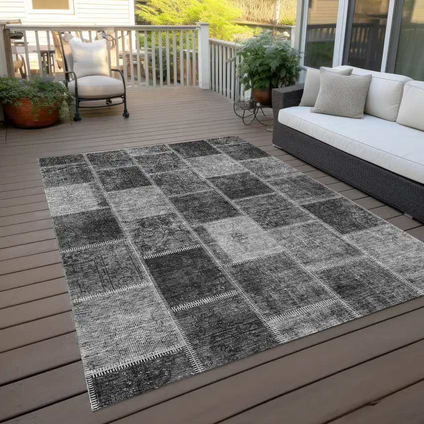 Add some artistry to your room with this 5-foot x 8-foot gray charcoal and silver patchwork washable indoor outdoor area rug. This rectangle shaped rug features a patchwork design that will work well both indoors or out. A classic shape marries with good looking design for your living room, hall, bedroom, porch, patio, or poolside. Ideal for outdoor spaces or high traffic areas with kids and pets, this rug is made from heavy duty polyester that is stain resistant to help repel water, dirt, and stains. Makes a great way to dress up your patio, porch, or poolside, but also works well as a durable and easy to maintain option in the kitchen, family room, or mudroom. 60-inch h x 90-inch w x 0.19-inch d.