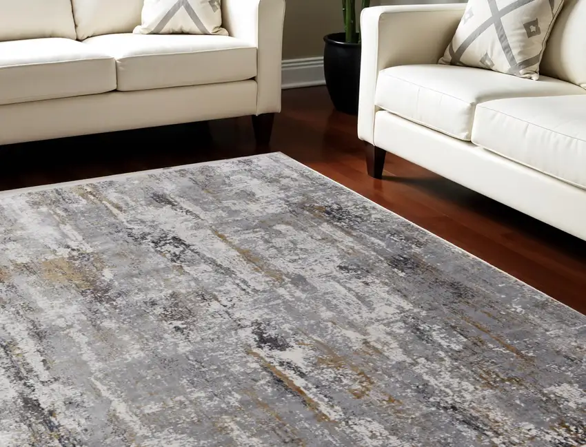 Gray Ivory and Gold Abstract Power Loom Area Rug With Fringe