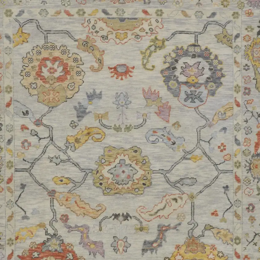Gray Red and Yellow Wool Oriental Hand Knotted Area Rug With Fringe