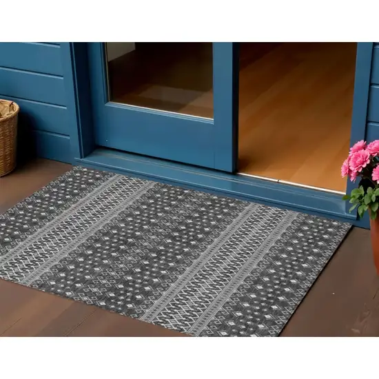 Set an inviting tone in your space with this 3-foot x 5-foot gray silver and charcoal tribal washable indoor outdoor area rug. This rectangle shaped rug features a tribal design that will work well both indoors or out. A classic shape marries with good looking design for your living room, hall, bedroom, porch, patio, or poolside. Ideal for outdoor spaces or high traffic areas with kids and pets, this rug is made from heavy duty polyester that is stain resistant to help repel water, dirt, and stains. Makes a great way to dress up your patio, porch, or poolside, but also works well as a durable and easy to maintain option in the kitchen, family room, or mudroom. 36-inch h x 60-inch w x 0.19-inch d.