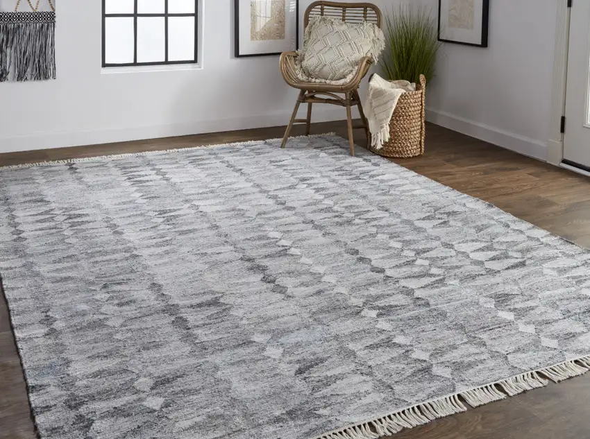 Gray Silver And Ivory Geometric Hand Woven Stain Resistant Area Rug With Fringe