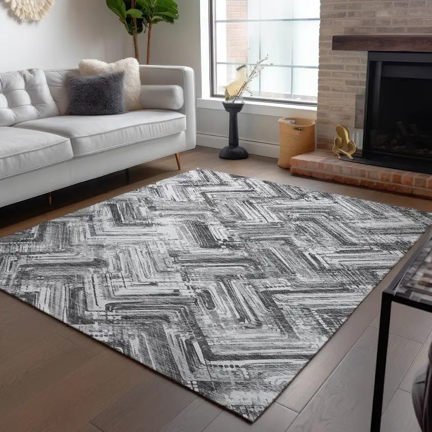 Add some artistry to your room with this 10-foot x 14-foot gray silver and ivory geometric washable indoor outdoor area rug. This rectangle shaped rug features a geometric design that will work well both indoors or out. A classic shape marries with good looking design for your living room, hall, bedroom, porch, patio, or poolside. Ideal for outdoor spaces or high traffic areas with kids and pets, this rug is made from heavy duty polyester that is stain resistant to help repel water, dirt, and stains. Makes a great way to dress up your patio, porch, or poolside, but also works well as a durable and easy to maintain option in the kitchen, family room, or mudroom. 120-inch h x 168-inch w x 0.19-inch d.