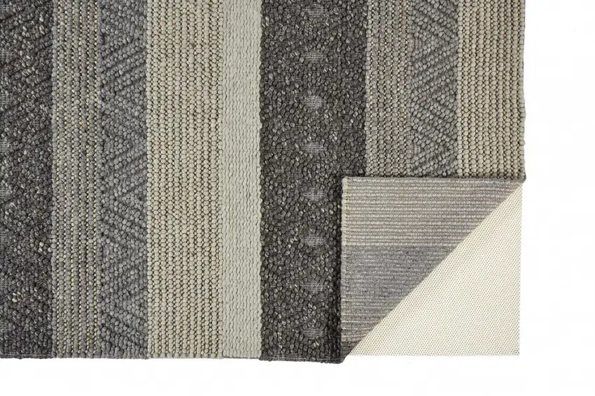 The Gray, Taupe, and Tan Wool Striped Hand-Woven Stain-Resistant Area Rug stands as a versatile addition to your existing décor, effortlessly blending in with a range of styles and color schemes.