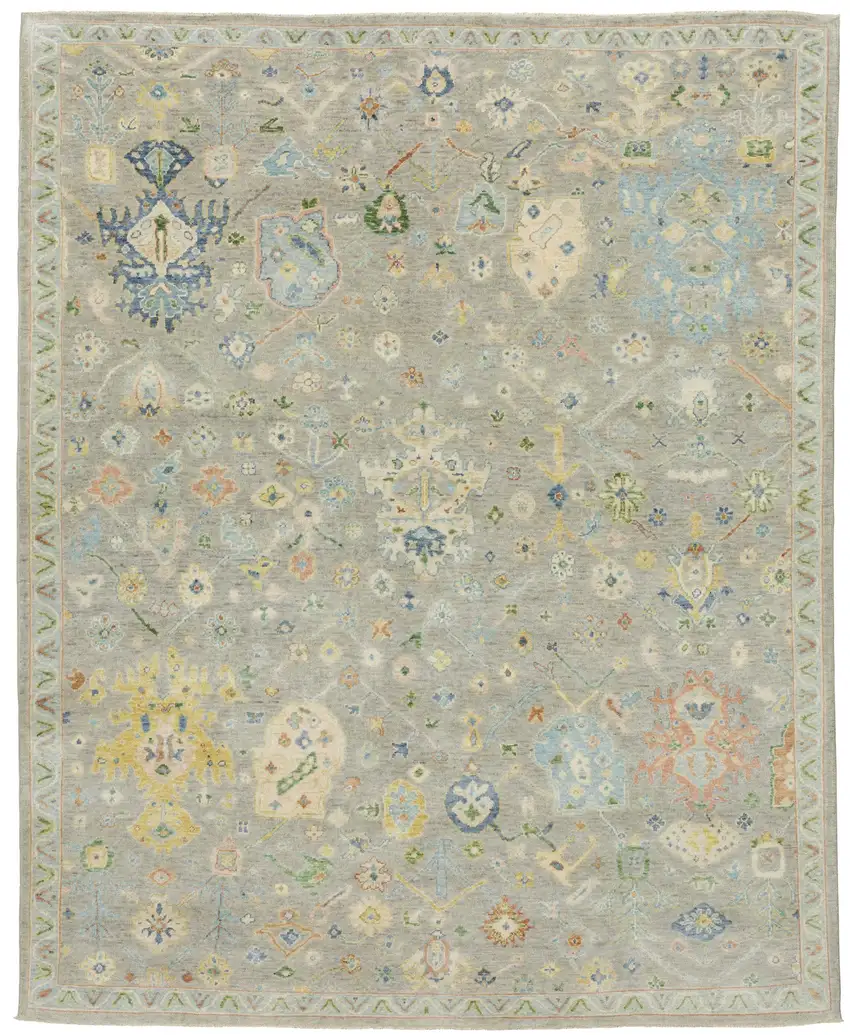 Gray Yellow And Green Wool Oriental Hand Knotted Area Rug With Fringe
