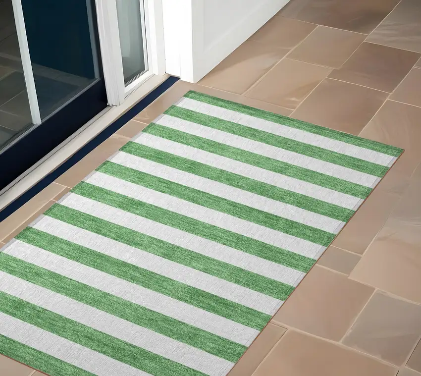 Green and White Striped Washable Non Skid Indoor Outdoor Area Rug