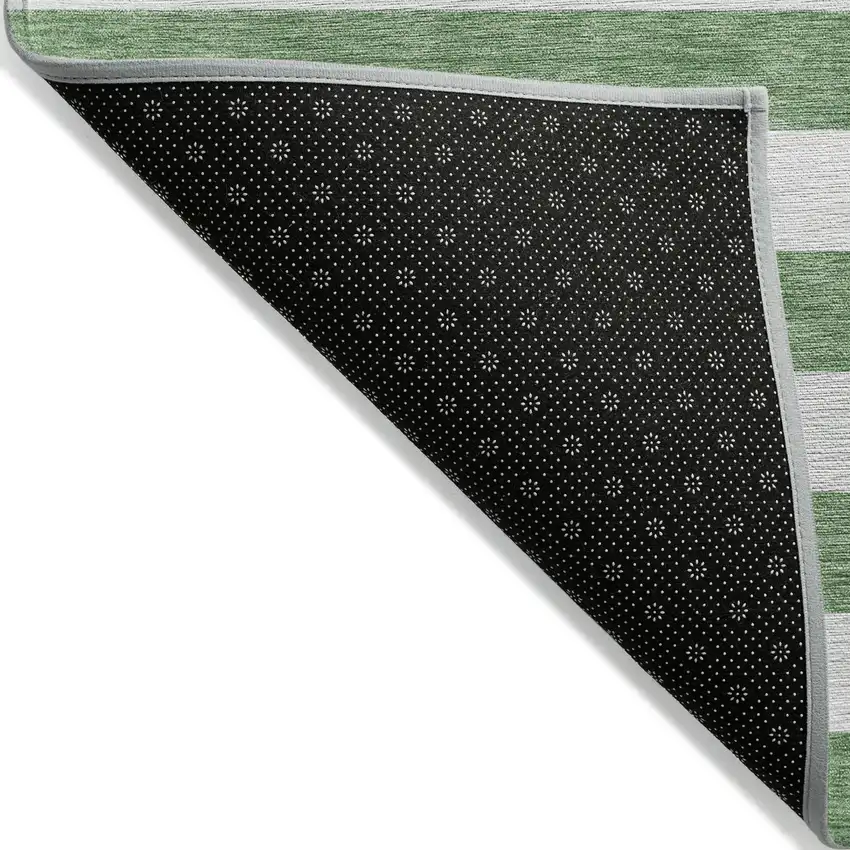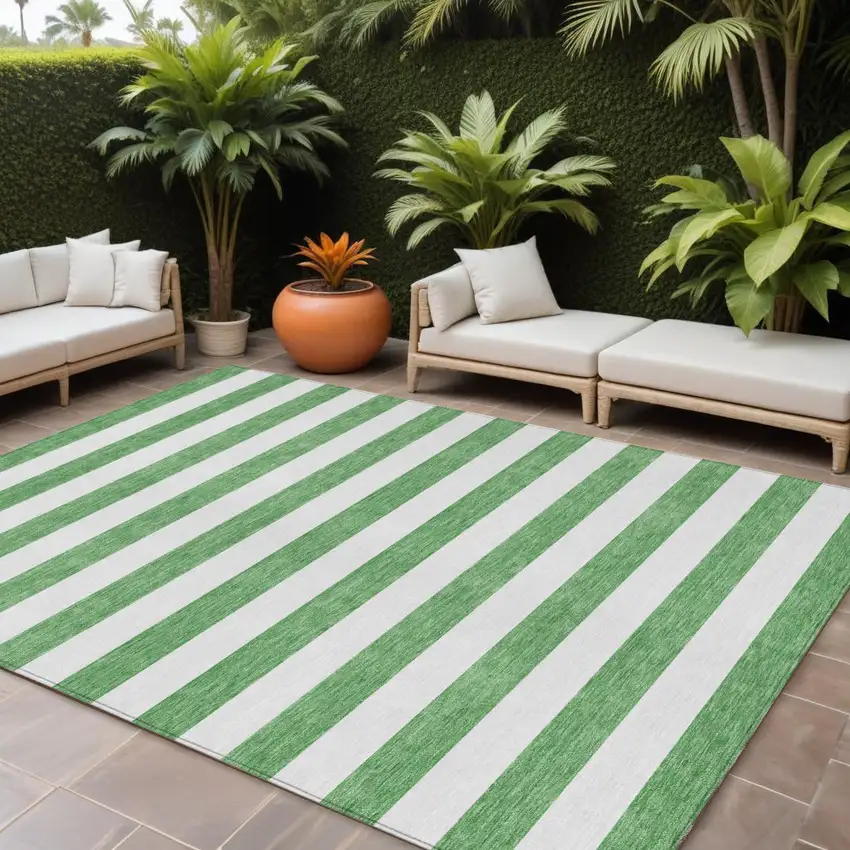 Set an inviting tone in your space with this 9-foot x 12-foot green and white striped washable stain resistant non skid indoor outdoor area rug. This rectangle shaped rug features a striped design in green and white to give it visual interest. A classic shape marries with good looking design for your space ideal for spaces with kids and pets, this rug is stain resistant to help repel stains and spilled liquids. Area rugs help to give warmth and sense of home to your space. 108-inch H x 144-inch W x 0.19-inch D
