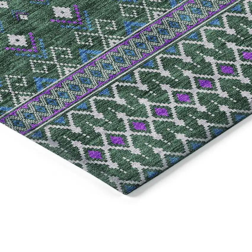 Add some artistry to your room with this 9-foot x 12-foot green blue and purple tribal washable indoor outdoor area rug. This rectangle shaped rug features a tribal design that will work well both indoors or out. A classic shape marries with good looking design for your living room, hall, bedroom, porch, patio, or poolside. Ideal for outdoor spaces or high traffic areas with kids and pets, this rug is made from heavy duty polyester that is stain resistant to help repel water, dirt, and stains. Versatile in use, durable, and easy to maintain, this rug is an ideal solution to add a decorative and inviting touch to your indoor or outdoor space. 108-inch h x 144-inch w x 0.19-inch d.