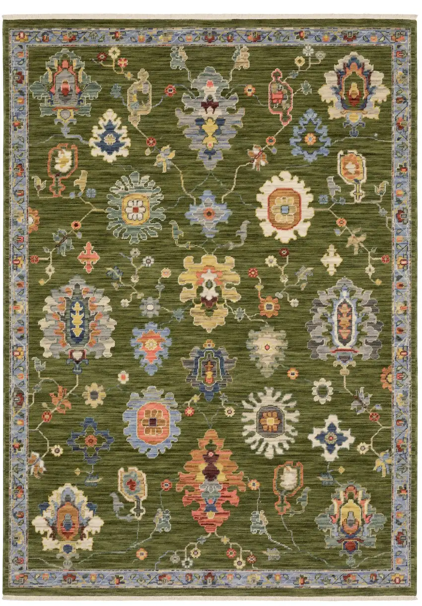 Green Blue And Yellow Oriental Area Rug With Fringe