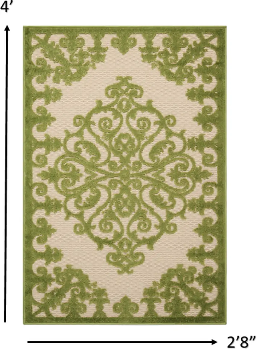 Moreover, this rug transcends customary boundaries, thanks to its versatility. Whether you're placing it indoors or outdoors, it seamlessly adapts to any environment, effortlessly enhancing the visual appeal of your chosen area. From your cozy living room to your favorite outdoor oasis, the Green Medallion Indoor/Outdoor Area Rug proves its adaptability, providing you with endless opportunities for creativity and personalization.