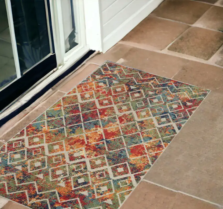 This 2-foot x 3-foot green orange and red geometric stain resistant indoor outdoor area rug, is a great way to add warmth to a room. This rectangle shaped rug features a geometric design in green orange and red to give it visual interest. A classic shape marries with good looking design for your space ideal for spaces with kids and pets, this rug is stain resistant to help repel stains and spilled liquids. Area rugs help to give warmth and sense of home to your space. 24-inch H x 36-inch W x 0.35-inch D