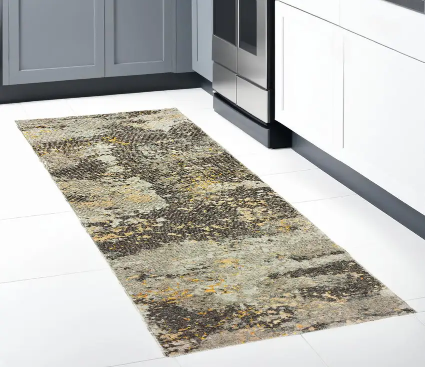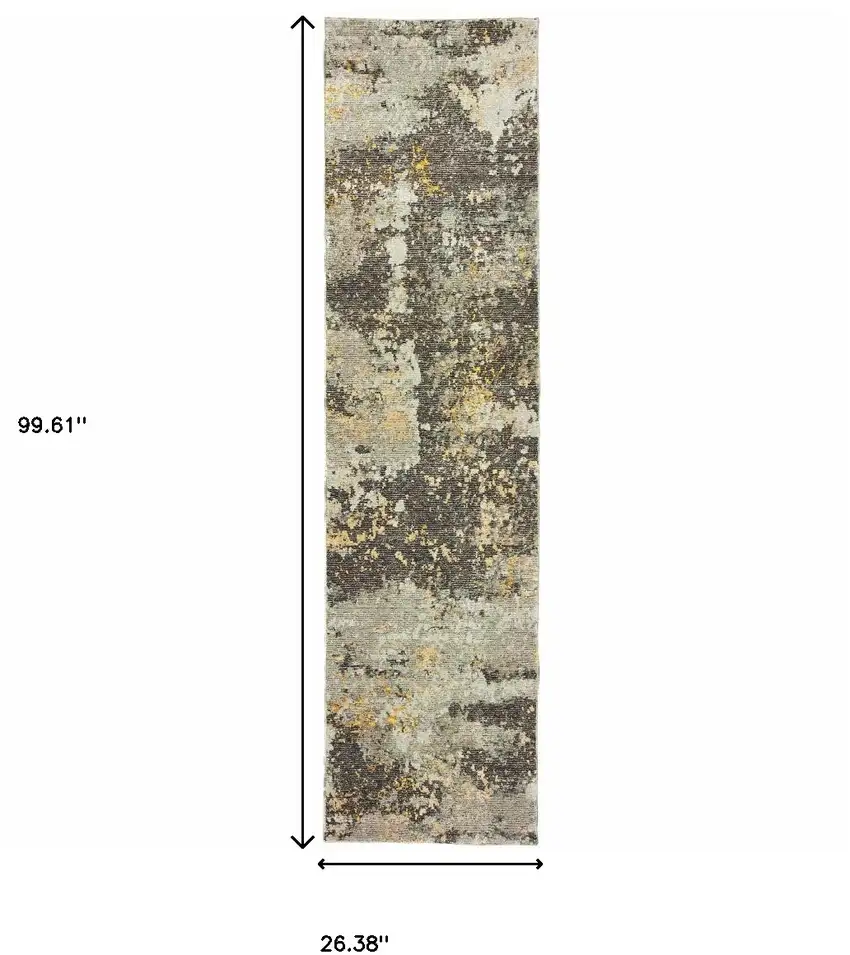 Grey And Gold Abstract Power Loom Stain Resistant Runner Rug