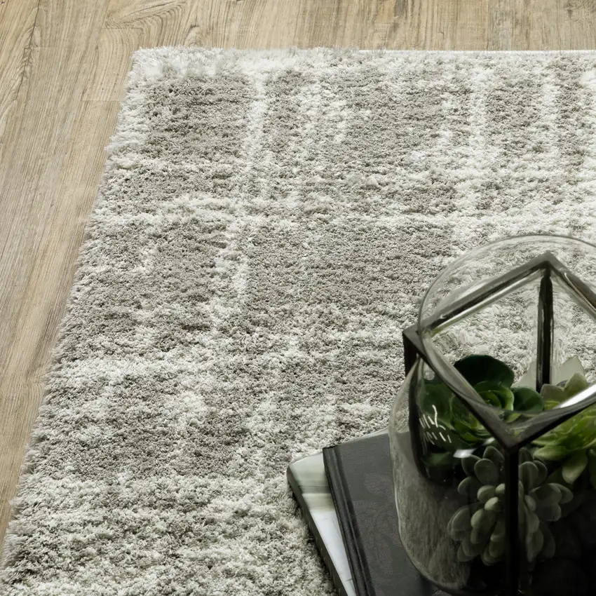 Grey And Ivory Abstract Shag Power Loom Stain Resistant Area Rug