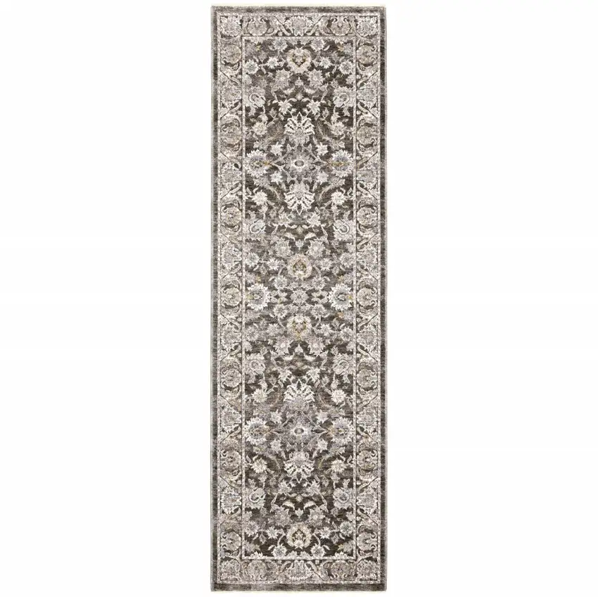 Grey And Ivory Oriental Power Loom Stain Resistant Runner Rug With Fringe