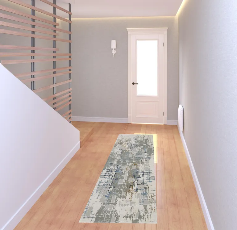This runner rug showcases a harmonious blend of grey, blue, brown, ivory, and deep blue hues. Its abstract design elevates any space, making it a versatile decor piece.