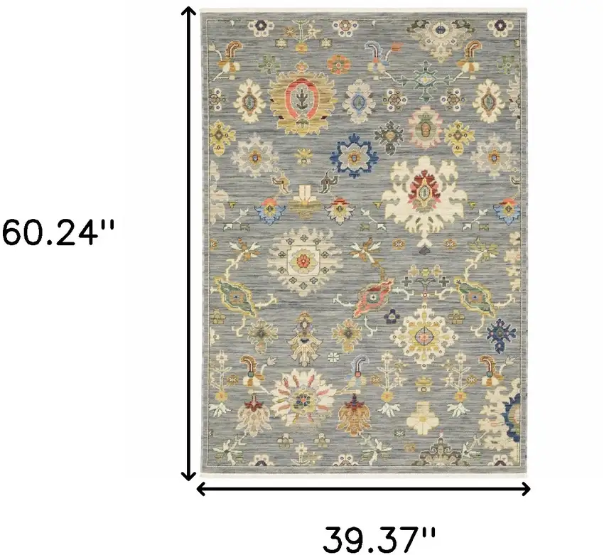 Add an elegant touch to your living space with this striking area rug featuring captivating hues of grey, ivory, gold, salmon red, blue, and green. Intricate Oriental patterns enhance its sophisticated look.