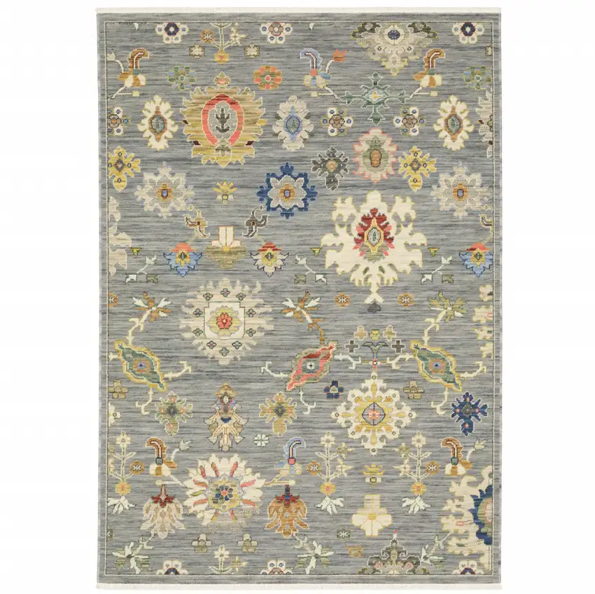 Grey Ivory Gold Salmon Red Blue And Green Oriental Power Loom Stain Resistant Area Rug With Fringe